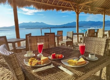 Open daily from 8 AM to 9 PM, our waterfront dining Gili Meno spot serves breakfast, lunch, and dinner. Walk-ins welcome - perfect for spontaneous meals with a view! We only recommended a reservation if you prefer a special seat with a particular seafront view and seafood BBQs. Please contact us directly.
