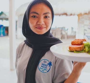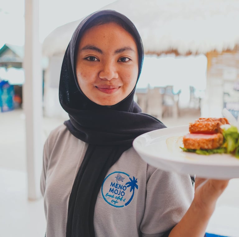 Savor unforgettable dining at our beachside restaurant, steps from your room at Meno Mojo Beach Resort. Greet the day with stunning sunrises over Gili Meno’s crystal-clear waters, where turtles glide just beyond the shore. Our warm, welcoming team crafts every dish with care, creating a relaxed atmosphere perfect for couples, families, or solo adventurers seeking authentic, budget-friendly Gili Meno flavors.